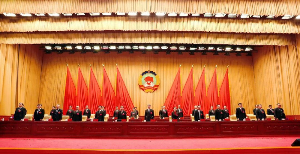 主席团成员在台上就座。甄宇主持会议。